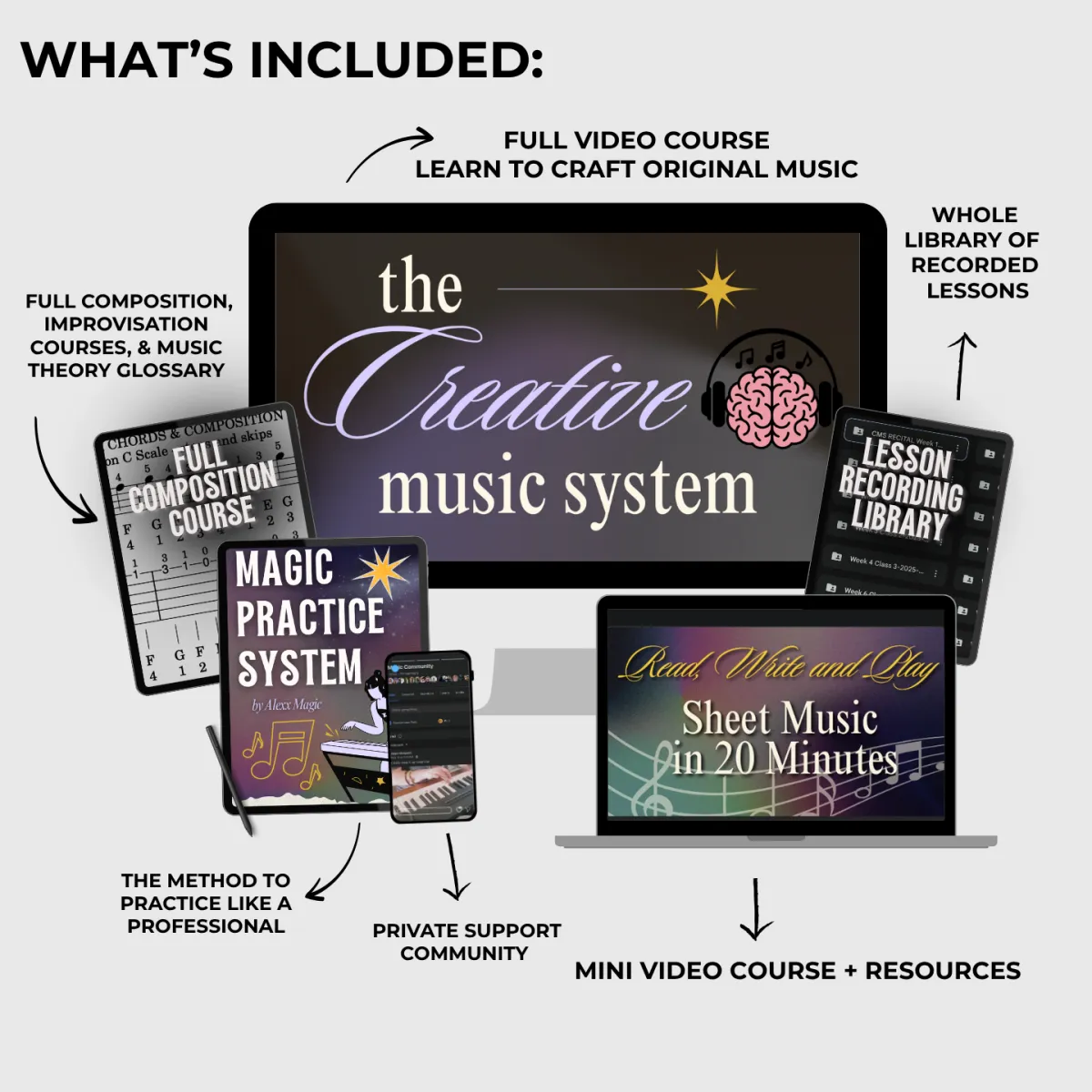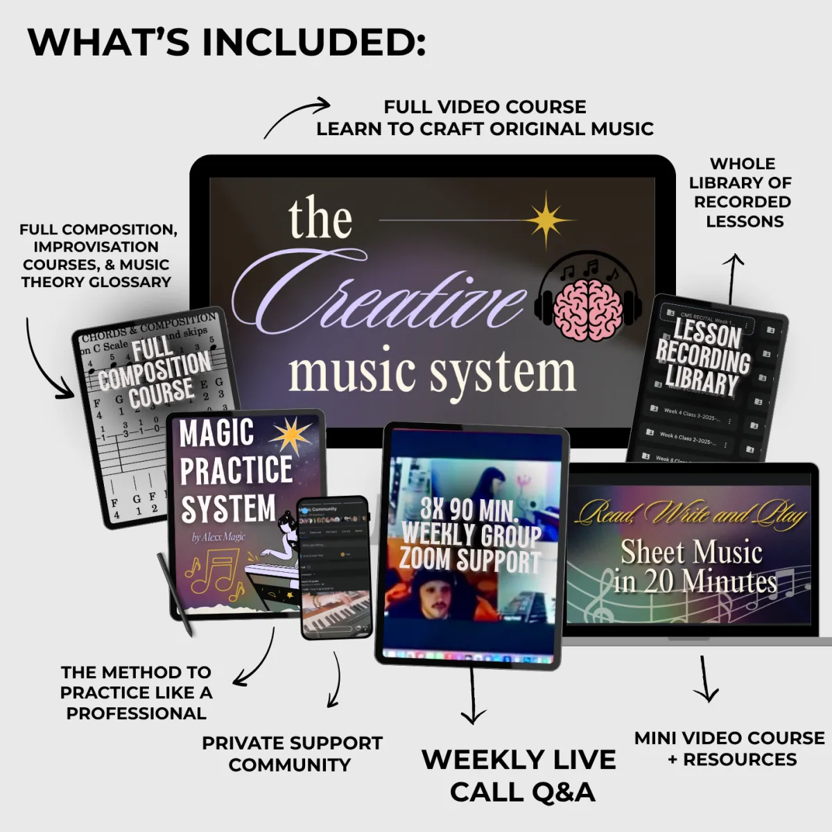 A: The Creative Music System can be purchased standalone for onetime fee of 97$ or with the live training for $133 per month as a subscription. No hidden fees.